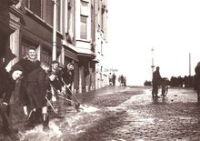 Op deΒ helling inΒ de HofstraatΒ zijn enkele vrouwen en kinderen druk in de weer om het door de storm overgeslagen water weg te houden van hun huizen.