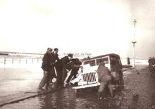 Zware storm, een jeep zit vast op de Albert I Promenade door een grondverzakking.Β
