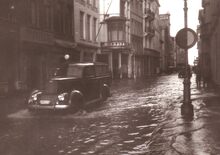 Hoek Lange- en Louisastraat onder water na voorjaarstorm in 1949,links achteraan de "Central".