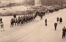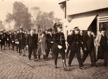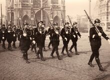 Een groep rijkswachters passeert op de Vindictevelaan tegen de hoek Aartshertoginnestraat,op weg naar een vaderlandse plechtigheid.