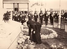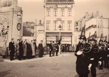 Een oudstrijder plaatst een bloemenkrans aan het oorlogsmonument op het Sint Petrus en Paulusplein tijdens een vaderlandse plechtigheid.Achter het rijkswachtdetachement hoek met Visserskaai nog altijd braak,het hoekhuis werd in W.O. II weggebombardeerd.