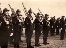 Een detachement rijkswachters marcheert op de Alfons Pieterslaan,ter hoogte van het kruispunt met de Leopold II laan ter gelegenheid van een vaderlandse plechtigheid.Links op de achtergrond de scheepswerven van het thans gedempte 3e handelsdok,rechts het gebouw van het Ijzerpanorama.