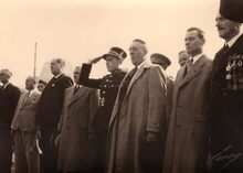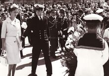 Prins Albert groet het vaandel,naast hem Prinses Paola,achter hem commodore Arsène ROBYNS (naast officier met sabel).Dit tijdens de intrede van het prinsenpaar te Oostende.