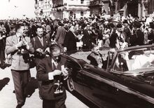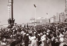 Intrede van Prins Albert en Prinses Paola te Oostende,bij hen staan Achiel VANACKER,minister van (?) en P.W. SEGERS,minister van defensie.