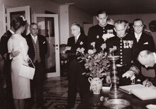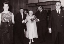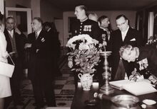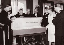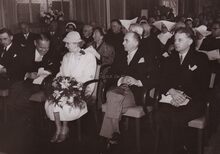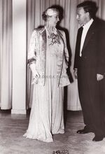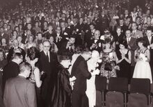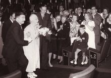 Formaat : 13 x 18 cm. - Koningin Elisabeth wordt door schepen Roger De Kinder naar haar plaats geleid voor het bijwonen van het Mozartconcert door het Belgisch Kamerorkest. Uiterst rechts achter het meisje in de witte jurk, Marcel Friederichs, gemeenteraadslid en naast hem, Frank Edebau, stadsconservator. Links (centraal), Roger De Ramée, directeur van het Kursaal, en mevrouw De Ramée.