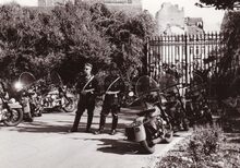 Een groep rijkswachters (met helm) op de binnenkoer van de kazerne aan de Alfons Pieterslaan.
