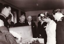 Formaat : 13 x 18 cm. - Koningin Elisabeth tussen Jan Piers, burgemeester en Roger De Kinder, schepen in gesprek met kunstschilder Albert Saverys, naar aanleiding van zijn tentoonstelling in het Kursaal