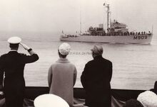 De hoogzeemijnenveger M.909 "F. Bovesse" vaart voorbij het Weststaketsel en wordt begroet door Prins Albert en Prinses Paola tijdens hun intrede te Oostende.