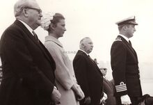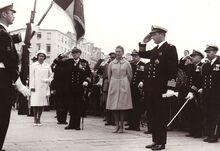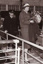 Prinses Margaretha II van Denemarken vergezeld van commandant Vanbellinghen op de loopplank van een "maalboot" aan de Natiënkaai. Zondagmorgen om 10 uur vertrok zij naar Dover om dan verder te reizen naar Londen