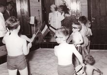 Koningin Elisabeth en een drietal jongens van de IBIS,rechts staat de directeur van de IBIS de heer CAESTECKER.