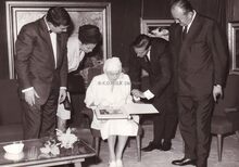 Formaat : 13 x 18 cm. - De Koninklijke Villa. Prinses Paola en Prins Albert in gesprek met : P.W. Segers, minister van Verkeerswezen en René Lefebvre, minister van Binnenlandse zaken. Achter hen burgemeester Jan Piers en rechts schepen François Van Caillie