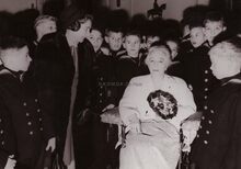 Koningin Elisabeth naast burgemeester Adolf VANGLABBEKE tijdens een bezoek aan Oostende.uiterst links naast de burgemeester provinciegoeverneur Pierre d'OUTRYVE d'YDEWALLE.Op de vierde rij een drietal "grijze" zusters met hun specifieke hoofdtooi.