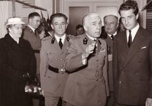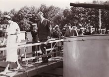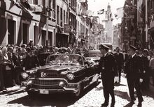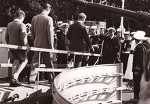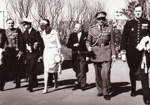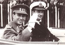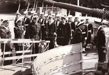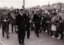 Prins Albert op het westerstaketsel ter gelegenheid van de jaarlijkse vlootparade,naast hem P.W. SEGERS,minister van defensie,achter hem twee officieren van de Zeemacht, links Kapitein ter Zee Jules DELFORGE, rechts Commodore ROBYNS. Ook burgemeester Jan PIERS is er bij. De Zeemacht-officier achteraan is Fregatkapitein Jules Van Dyck, de latere Admiraal.