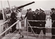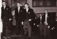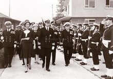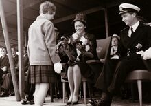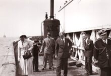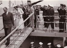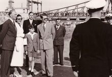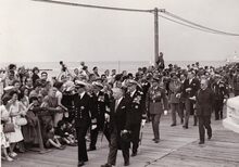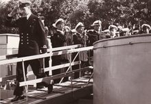 De koninklijke familie gaat terug aan wal,begeleid door bootsmansfluitjes,van op een schip van de Zeemacht.Vooraan Koning Leopold III, Liliane BAELS,Prins Alexander,Prins Albert.Verder commodore Arsene ROBIJNS en commodore TIMMERMANS.