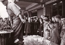 Formaat : 13 x 18 cm. - Prins Albert op bezoek bij de vislossers in de Oostendse vismijn. Rechts van hem burgemeester Adolf Van Glabbeke. Links, de directeur van de vissershaven Gustave Velthof en schepen Maurice Quaghebeur sr.