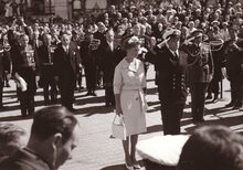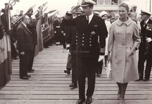 Prins Albert in het uniform van fregatkapitein en Prinses Paola schouwen een erewacht van de Zeemacht tijdens hun bezoek aan Oostende naar aanleiding van de aankomst van de hoogzeemijnenveger "J.E. Van Haverbeke" uit de Verenigde Staten. Links van de prinses Korvetkapitein Vervynck (met sabel). Rechts van de prins Kapitein ter Zee Delforge.