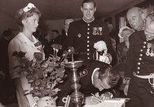 Formaat : 13 x 18 cm. - Prins Albert tekent het gulden boek van de stad Oostende in de Koninklijke Villa tijdens zijn blijde intrede te Oostende met zijn aanstaande Prinses Paola. Centraal burgemeester Jan Piers. Uiterst rechts, de schepenen Frans Van Caillie en Kamiel Dehouck
