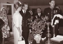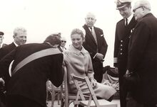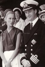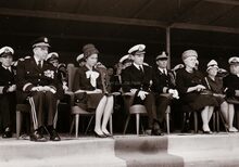 Prins Albert en Prinses Paola op de eretribune bij hun bezoek te Oostende naar aanleiding van de overdracht van de hoogzeemijnenveger "J.E. Van Haverbeke" uit de Verenigde Staten. De officier uiterst links is Kapitein ter Zee Jules Delforge. De officier uiterst rechts is Kapitein ter Zee Petitjean.