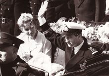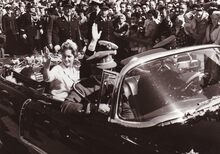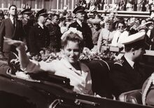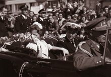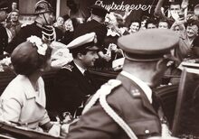 Tijdens de intrede van het prinsenpaar Albert en Paola te Oostende,wordt de hand van Prinses Paola gekust door een marine officier,achter haar P.W. SEGERS,minister van defensie,Prins Albert en Achiel VANACKER,minister van (?) kijken toe.
