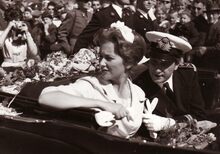 Formaat : 13 x 18 cm. - Mooie foto van een blijde bevolking die het prinsenpaar verwelkomt. Overal hangen vlaggen en over de straat hangen seinvlaggen van de zeevaart. Hier in de Nieuwstraat