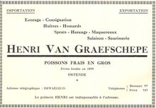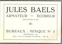 PrivΓ© : rue de la Chapelle, 93, Ostende. Firme fondΓ©e en 1878. Ecoreur : "A, Dieppe, agent dont la fonction consiste Γ inscrire toutes les ventes de poisson faites au port, d'en opΓ©rer et garantir la livraison, de dΓ©livrer les notes quotidiennes de ces livraisons, d'inscrire chaque jour les achats chez les mareyeurs et saleurs". DELAHAIS, Notice historique sur l'Γ©corage, 1873, p.9. Ecoreur : Terme de pΓͺche. Homme chargΓ© par l'Γ©quipage de tenir compte du poisson livrΓ© aux marchands. Ecoreur : In de zeevisserij in Frankrijk. "The ecoreur is usually a qualified man appointed by the owners of the vessels, the municipality, or by an association termed the "SociΓ©tΓ© d'Ecorage". He performs the functions of a wholesale agent between the fisherman and the public. He is ready to take the fish out of the fisherman's hands as soon as they landed. He buys the fish from the fisherman, and pays at once, deducting a percentage for his own services. This percentage is sometimes 5, 4 or even as low as 3 1/2 percent. He undertakes the whole risk of selling the fish, and suffers loss that may be incurred by bad debts or bad sale, for which he can make no claim whatever upon the owner of the boat" The Harvest of the sea / James G. Bertram. London : John Murray, 1869. Uit : Het Nieuw Visscherijblad van 22/10/1948, p.1-2 : Zijn de "Verenigde Visaflsagers" handelaars of niet ?. "De taak van een visafslager bestaat hierin : 1. de vis sorteren en wegen om hem klaar te maken voor verkoop. 2. de vis bij afslag verkopen. 3. de opbrengst van de verkoop innen, en het netto-bedrag verdelen tussen de reder en de bemanning, na aftrek : van het commissieloon van de afslager dat schommelt tussen 1 t.h. en 1,75 t.h. van de brutto-opbrengst van de verkoop ; van het haven- en mijngeld ; van de huur der bennen ; van wat er nog verschuldigd is op de leveringen van ijs, brandstof, provisie, enz., en ook nadat de afhoudingen wegens de sociale wetten zijn voorafgenomen". Zie ook foto, nummer FT/E0262 op de beeldbank van het Archief Oostende : Groepsfoto, bedrijf J. Baels in de Nieuwe Vismijn 49. Opschrift : J. Baels. Ecoreur. Vischafslager.