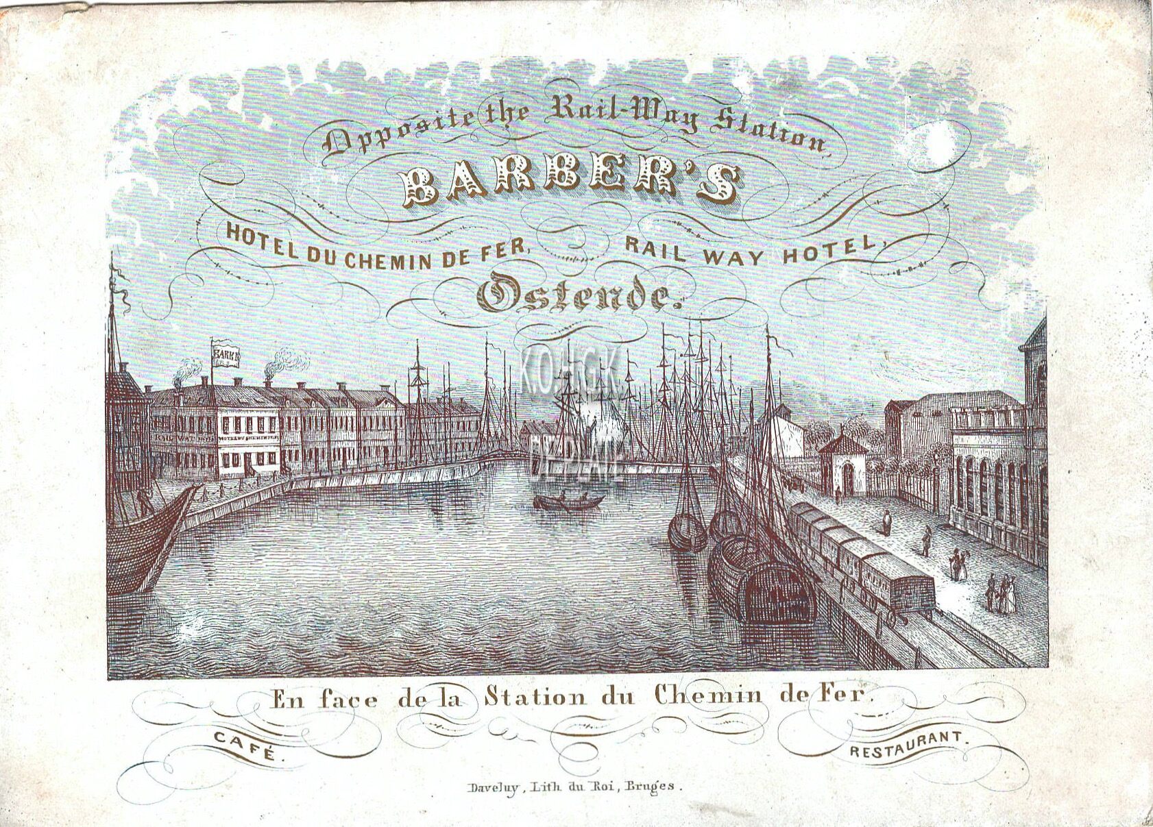 Formaat : 10,3 x 14,4 cm. - Hotel du Chemin de Fer. Barber's Rail Way Hotel opposite the Rail-Way Station Ostende. En face de le Station du Chemin de Fer. Café Restaurant. Gelegen op de hoek van de Kapellestraat en de Keizerskaai.