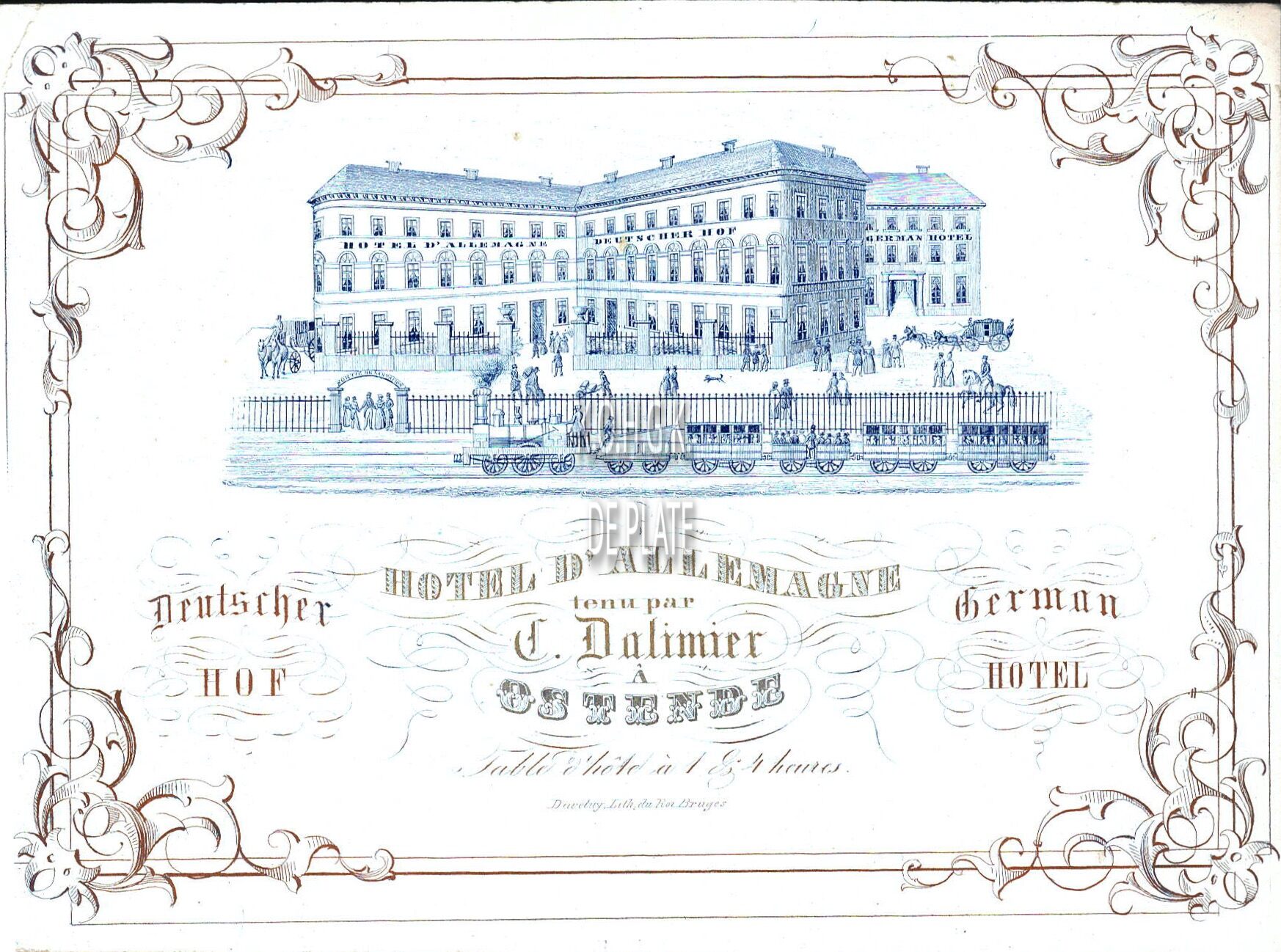Formaat : 11,1 x 14,9 cm. - Hôtel d'Allemagne tenu par C.Dalimier à Ostende. Deutscher Hof. German Hotel. Table d'hôte à 1 & 4 heures.