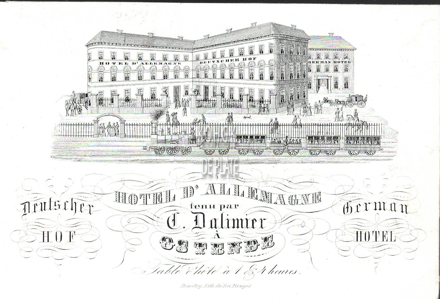 Omschrijving Format : 8,5 x 13 cm. - Hotel d'Allemagne tenu par C. Dalimier à Ostende. Deutscher Hof. German Hotel. Table d'hôte à 1 & 4 heures. Trefwoorden GEPORSELEINDE KAARTEN HOTEL D'ALLEMAGNE (POLDERSTRAAT) HOTELS (OUDE) DALIMIER C. (HOTELIER) POLDERSTRAAT TABLE D'HÔTE (GEZAMENLIJKE GASTENTAFEL) HORECAZAKEN GEPORSELEINDE KAARTEN (DEFINITIE) Plaatskenmerk ARCHIEF 110 ARCHIEFDOOS GEPORSELEINDE KAARTEN Inventarisnummers 2010/1239 1840 1865 Collectie Archief De Plate Herkomst AANKOOP Uitgever Daveluy Lith. du roi Bruges Print