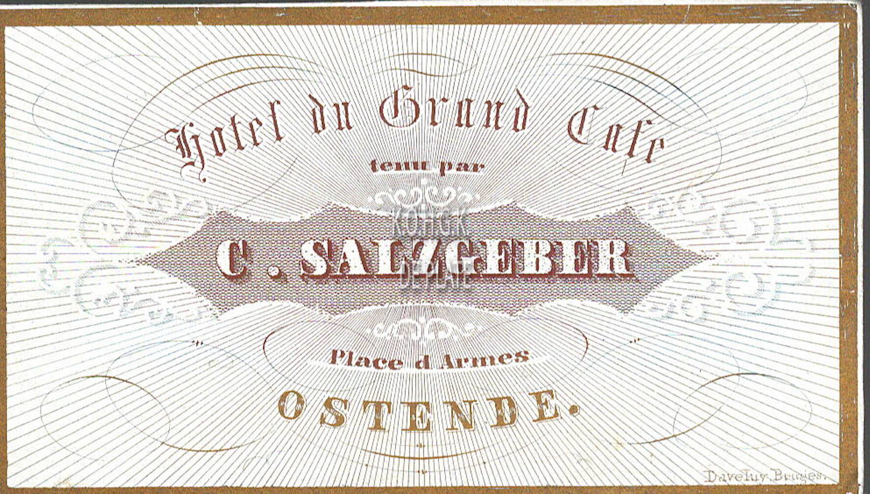 Omschrijving Formaat : 5 x 8,5 cm. - Hotel du Grand Cafe tenu par C. Salzgeber, Place d'Armes Ostende Trefwoorden GEPORSELEINDE KAARTEN HOTEL DU GRAND CAFE HOTELS (OUDE) WAPENPLEIN SALZGEBER C. (HOTELIER) ADVERTENTIES ; HORECA GEPORSELEINDE KAARTEN (DEFINITIE) Plaatskenmerk ARCHIEF 110 ARCHIEFDOOS GEPORSELEINDE KAARTEN Inventarisnummers 1977/1314 1840 1865 Collectie Archief De Plate Uitgever Daveluy Bruges Print
