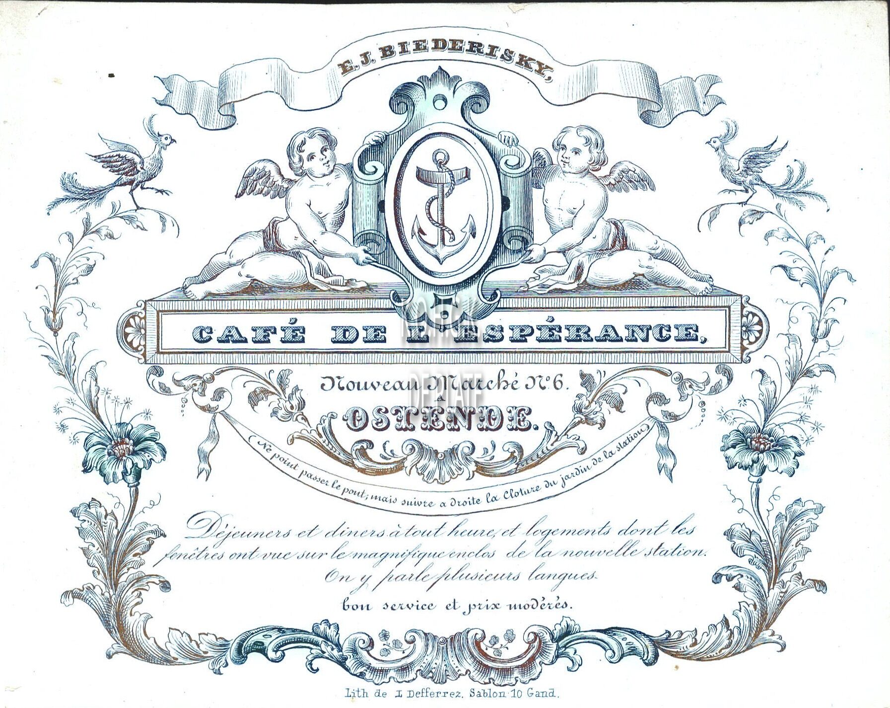 Formaat : 12,1 x 15,4 cm. - E.J.Biederisky. Café de L'Espérance. Nouveau Marché N° 6 Ostende. Ne point passer le pont, mais suivre a droite la Cloture du jardin de la station. Déjeuners et diners à tout heure et logements dont les fenêtres ont vue sur le magnifique enclos de la nouvelle station. On y parle plusieurs langues. Bon service et prix modérés.