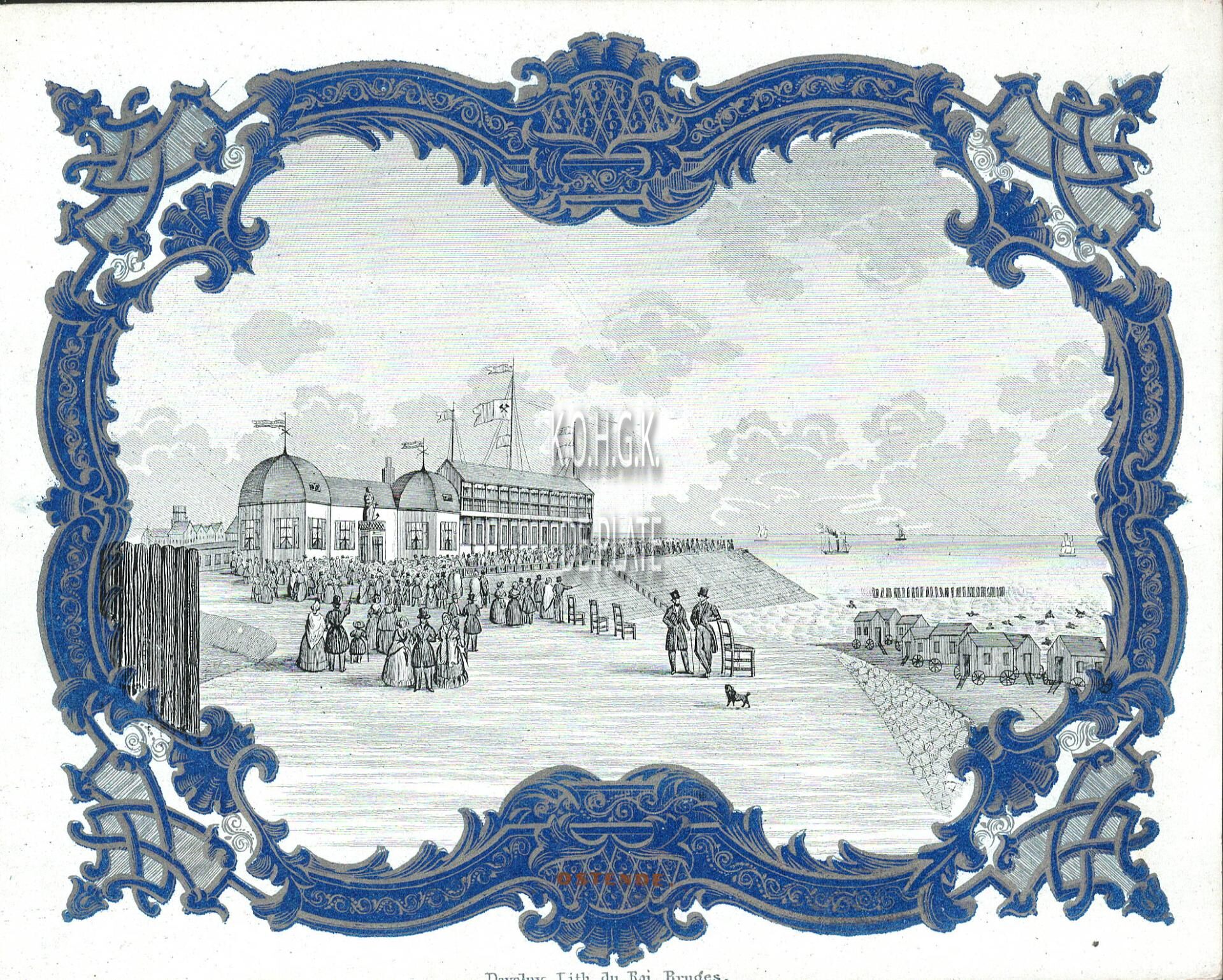 Formaat : 13,5 x 17 cm. - Ostende. De Zeedijk en het "Pavillon Royal". Rechts het klein strand en de badkarren. Blauw ingekleurd