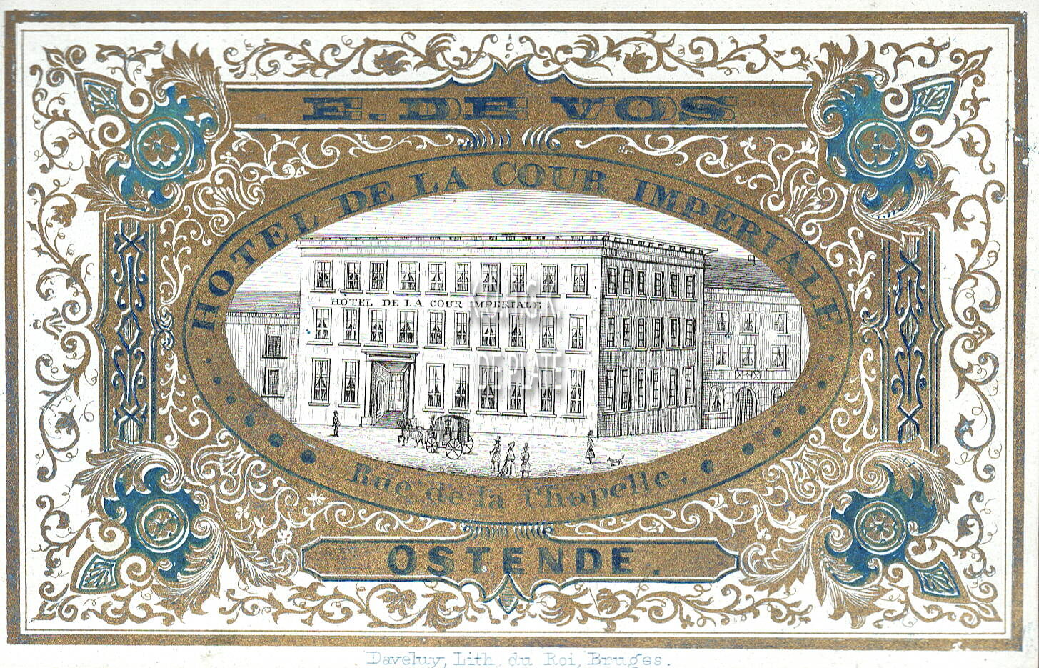 Omschrijving Formaat : 8 x 12,6 cm.- E. De Vos Hotel de la cour Impériale - Rue de la Chapelle - Ostende Trefwoorden GEPORSELEINDE KAARTEN HOTEL DE LA COUR IMPERIALE HOTELS (OUDE) KAPELLESTRAAT DE VOS E. (HOTELIER) HORECAZAKEN GEPORSELEINDE KAARTEN (DEFINITIE) Plaatskenmerk ARCHIEF 110 ARCHIEFDOOS GEPORSELEINDE KAARTEN Inventarisnummers 2010/1241 1840 1865 Collectie Archief De Plate Herkomst AANKOOP Uitgever Daveluy Lith. du roi Bruges Print