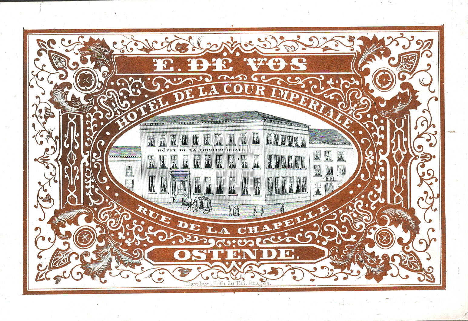 Omschrijving Formaat : 9,1 x 13,1 cm. - E.De Vos - Hotel de la cour Imperiale - Rue de la Chapelle - Ostende. Trefwoorden GEPORSELEINDE KAARTEN HOTEL DE LA COUR IMPERIALE HOTELS (OUDE) DE VOS E. (HOTELIER) KAPELLESTRAAT HORECAZAKEN GEPORSELEINDE KAARTEN (DEFINITIE) Plaatskenmerk ARCHIEF 110 ARCHIEFDOOS GEPORSELEINDE KAARTEN Inventarisnummers 2010/1242 1840 1865 Collectie Archief De Plate Herkomst AANKOOP Uitgever Daveluy Lith. du roi Bruges Print