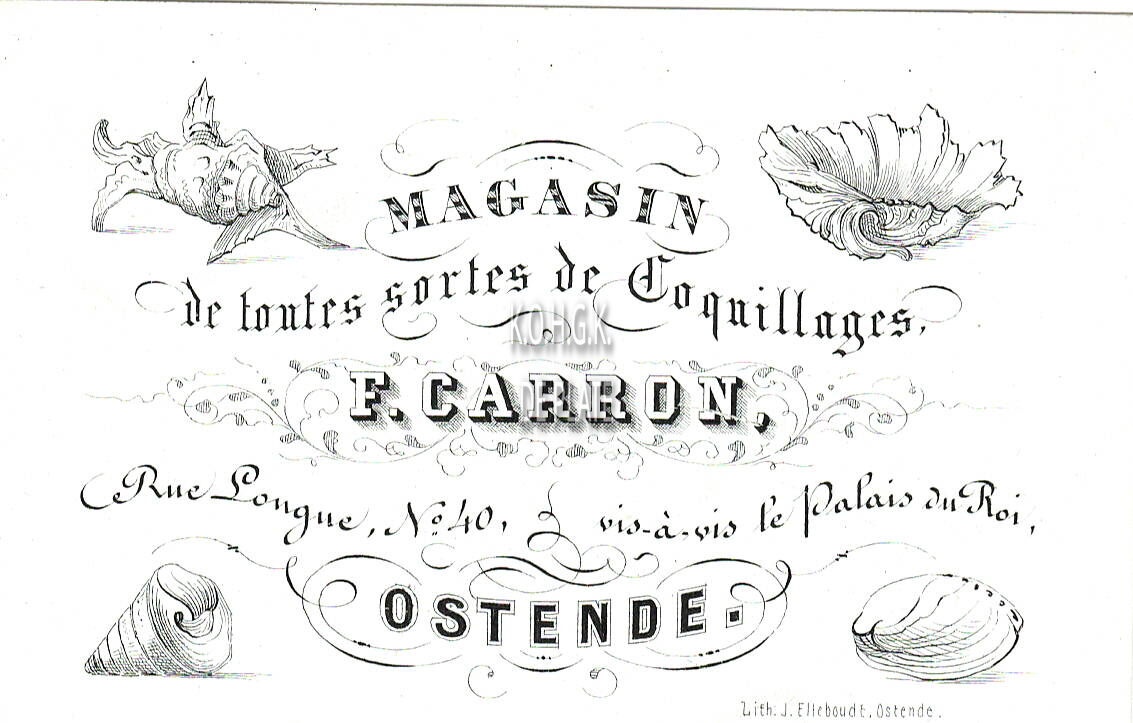 Formaat : 6,2 x 10 cm. - Magasin de toutes sortes de Coquillages, F. Carron, Rue Lonque N° 40, vis-à vis le Palais du Roi Ostende.