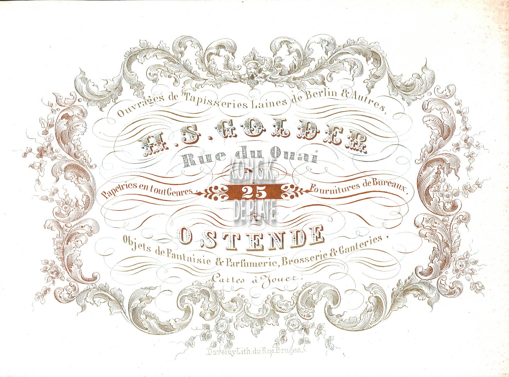 Formaat : 10,5 x 14,1 cm. - Ouvrages de Tapisseries, Laines de Berlin & autres. H.S.Golder, Rue du Quai N°25 Ostende. Papeteries en tout Genres, Fournitures de Bureaux, Objets de Fantaisie & Parfumerie Brosserie & Ganteries. Cartes à Jouer.