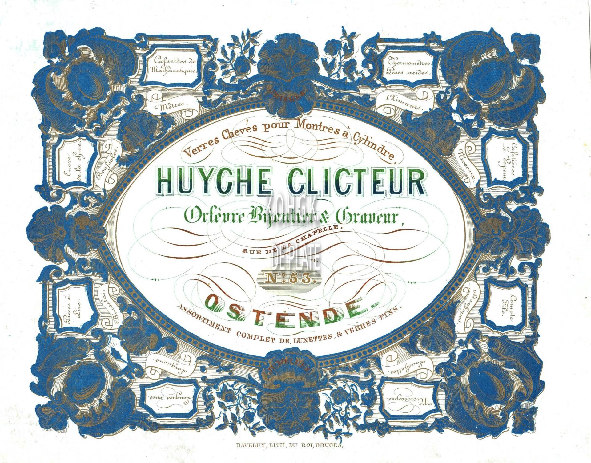 Formaat : 17,2 x 22,4 cm. - Huyghe Clicteur, Orfévre Bijoutier & Graveur. Rue de la Chapelle N°53 Ostende. Assortiment complet de lunettes & verres fins. Prismes. Jumelles. Métres. Aimants. Niveaux. Stanhopes. Louchettes. Lorgnons. Boussoles. Binocles. Cassettes de Mathématiques. Thermomêtres pèses acides. Cafetiêres a Vapeur. Compte Fils. Microscopes. Lonques veus. Piéces à Lire. Encre de la Chine. Blauw en goud ingekleurd.