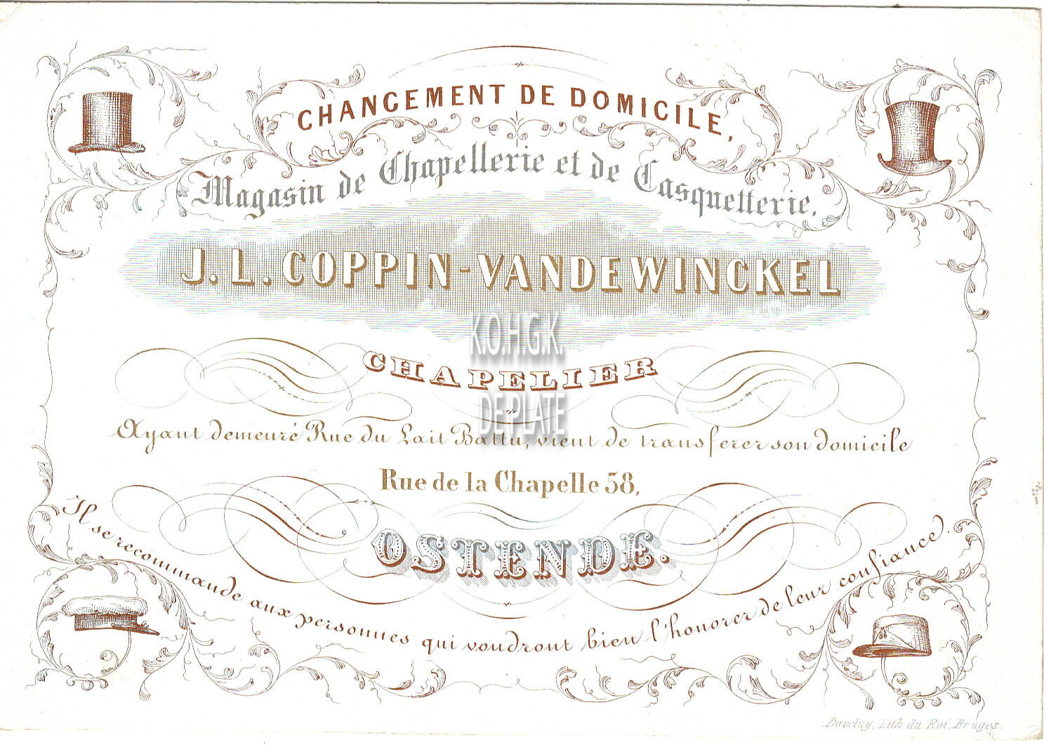 Formaat : 8,8 x 12,6 cm. - Changement de domicile Magasin de Chapelerie et de Casquetterie J.L.Coppin-Vandewinckel Chapelier. Ayant demeuré Rue du Lait Battu, vient de transferer son domicile Rue de la Chapelle 58 Ostende. Il se recommande aux personnes qui voudront bien l'honorer de leur confiance.