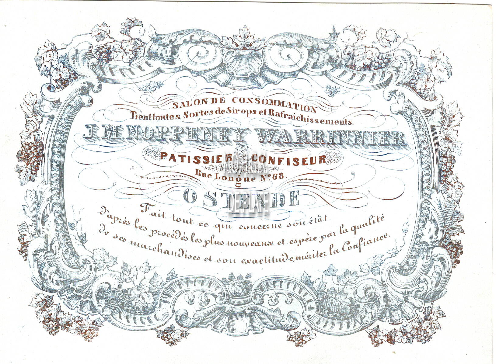 Formaat : 10,2 x 13,7 cm. - Salon de consommation. Tient toutes Sortes de Sirops et Refraichissements. J.M.Noppeney Warrinnier, Patisier Confiseur, Rue Longue N°68 Ostende. Fait tout ce qui concerne son étât d'après les procédés les plus nouveaux et espère par les qualité de ses marchandises et son exactitude mériter la Confiance.