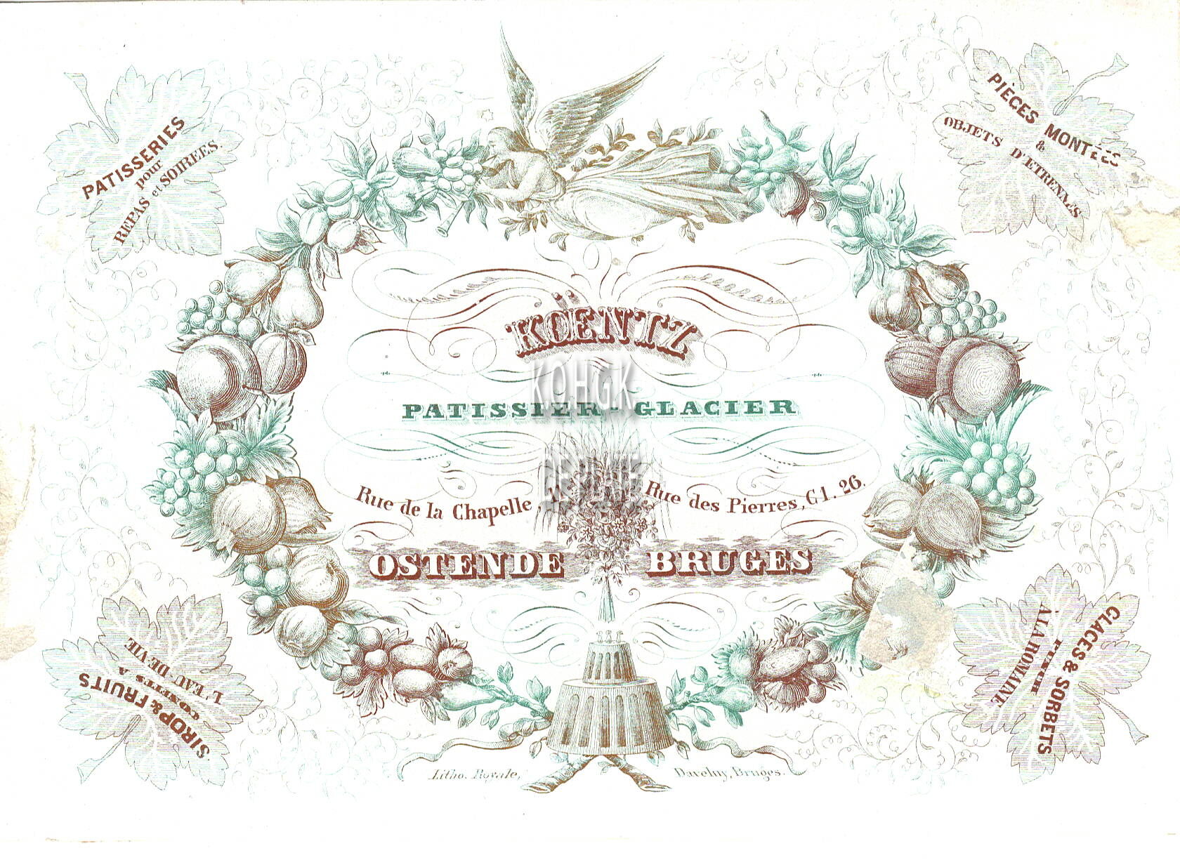 Formaat : 10,1 x 14,4 cm. - Koentz. Patissier-Glacier. Rue de la Chapelle 11 Ostende. Rue des Pierres CI 26 Bruges. Patisseries pour repas et soirées. Pieces montées & objets d'etrennes. Glaces & Sorbets Punch à la Romaine. Sirop & Fruits conftts à l'eau-de-vie.