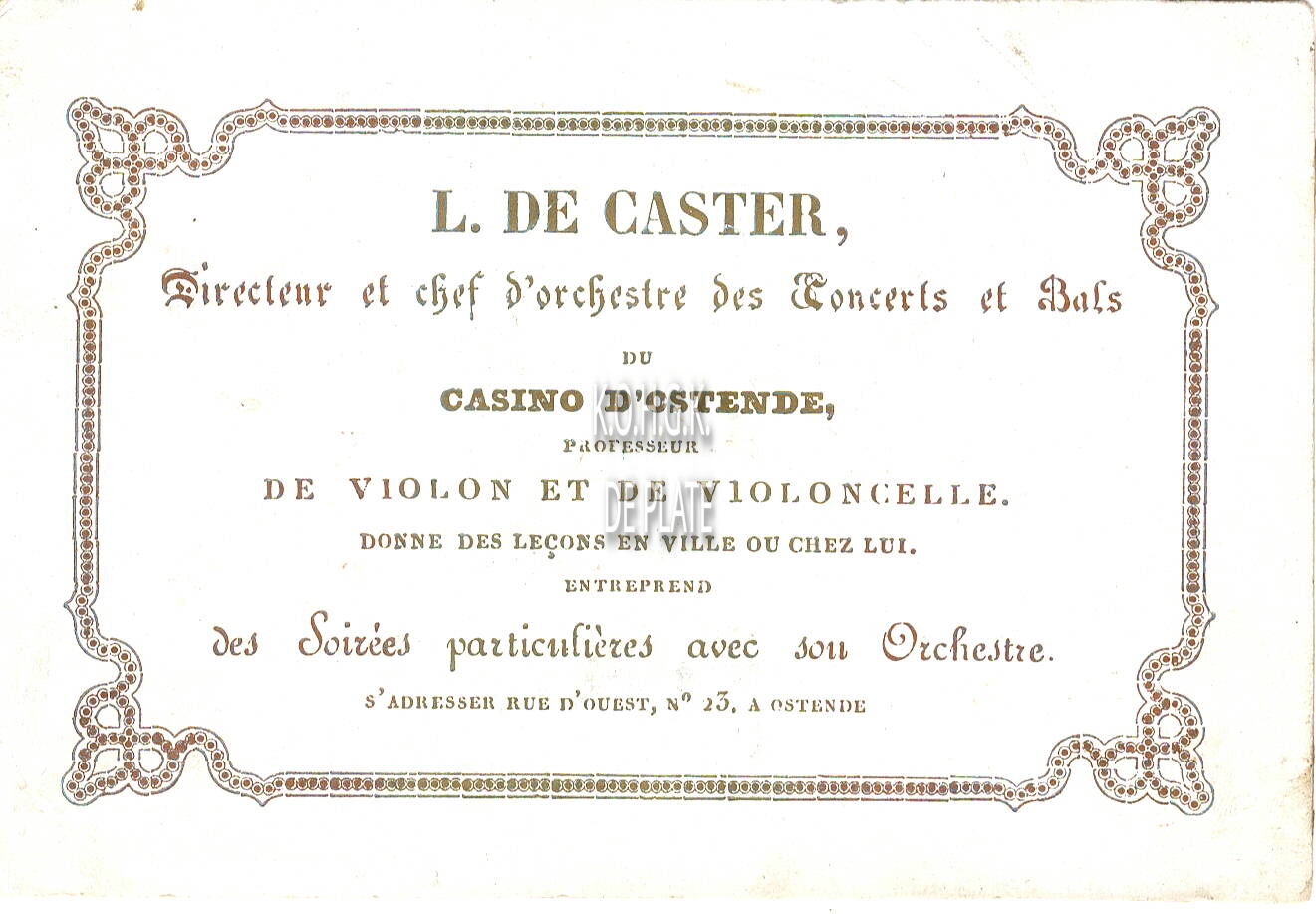 Formaat : 7,8 x 11,2 cm. - L. DE CASTER, Directeur et chef d'orchestre des Concerts et Bals du Casino d'Ostende. - Professeur de Violon et de Violoncelle, donne des leçons en Ville et chez lui entreprend des Soirées particulières avec son Orchestre . S'Adresser Rue d'Ouest N° 23 à Ostende.