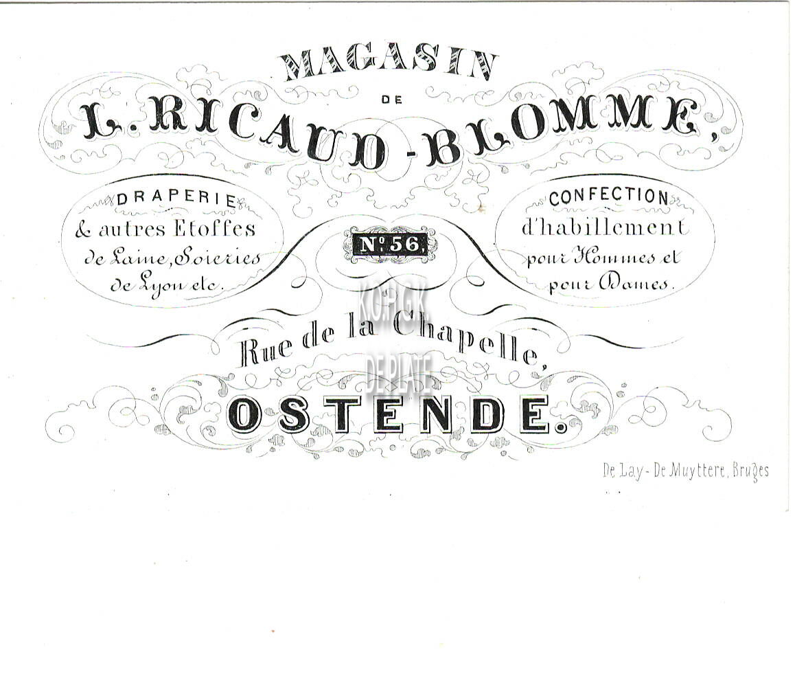 Formaat : 6,2 x 10 cm. - Magasin de  Draperie & autres étoffes de Laine. Soieries de Lyon etc..Confection d'habillement pour Hommes et pour Dames. L Ricaud-Blomme, Rue de le Chapelle N° 56 Ostende.