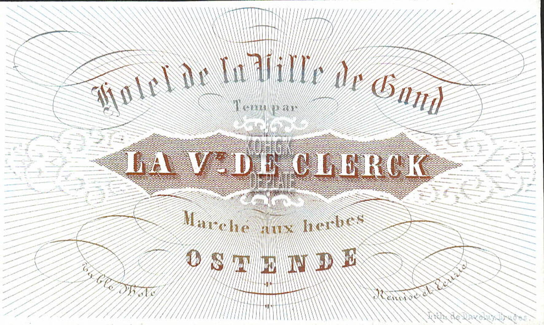 Omschrijving Formaat : 5,1 x 8,5 cm. - Hotel de la Ville de Gand Tenu par La Vve De Clerck. Marché aux herbes Ostende. Tables d'hôte. Remises et Ecurie. Trefwoorden GEPORSELEINDE KAARTEN HOTEL DE LA VILLE DE GAND HOTELS (OUDE) GROENTEMARKT WEDUWE A. DE CLERCK (HOTELIERSTER) TABLE D'HÔTE (GEZAMENLIJKE GASTENTAFEL) HORECAZAKEN GEPORSELEINDE KAARTEN (DEFINITIE) Plaatskenmerk ARCHIEF 110 ARCHIEFDOOS GEPORSELEINDE KAARTEN Inventarisnummers 2010/1229 1840 1865 Collectie Archief De Plate Herkomst AANKOOP Uitgever Lith. Daveluy Bruges Print