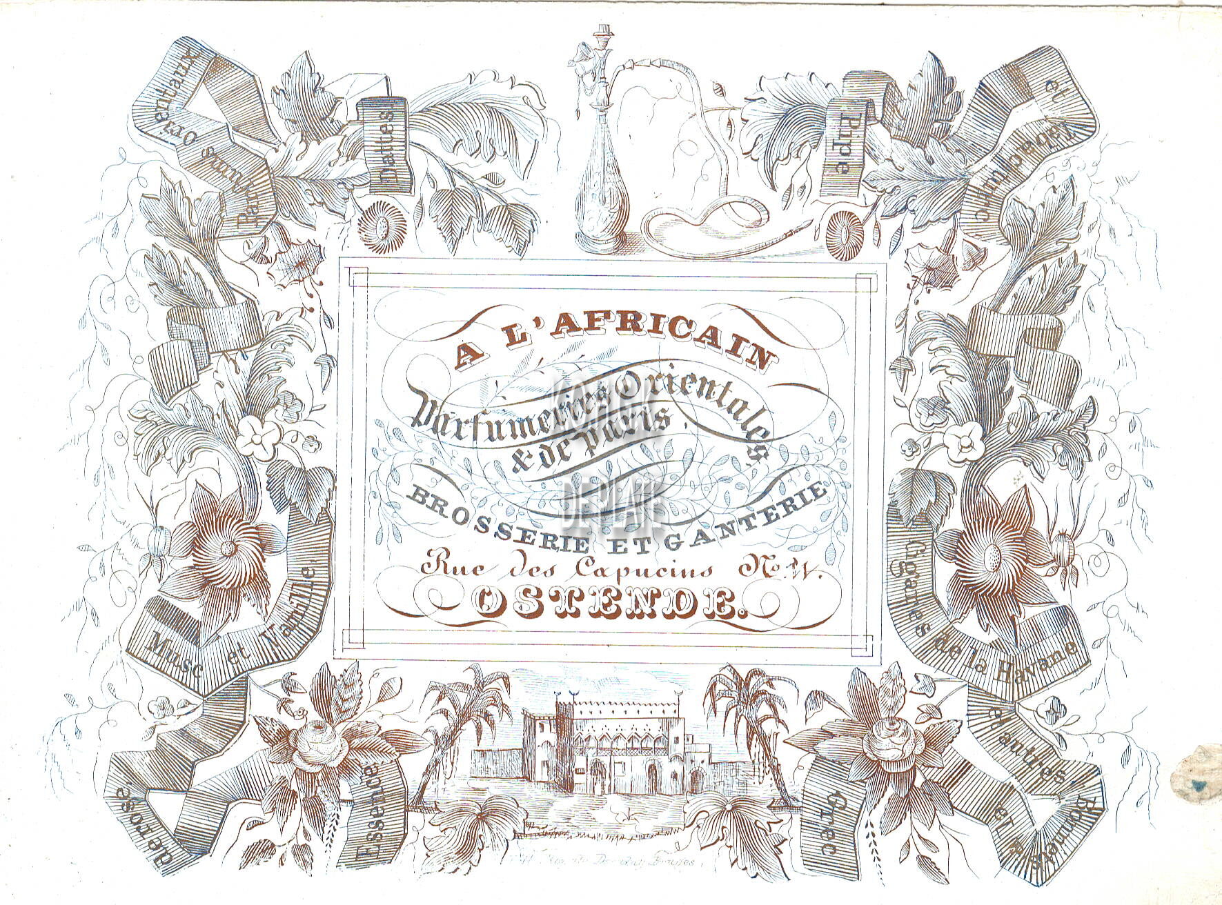 Formaat : 11,2 x 14,8 cm. - A L'Africain, Parfumeries Orientales et de Paris, Brosserie et Ganterie. Rue des Capucins N° 11 Ostende. Essence de rose. Muscs et Vanille. Parfums Orientaux. Pipes et Tabac turc. Cigares de la Havane et autres. Bonnets à la Grec.