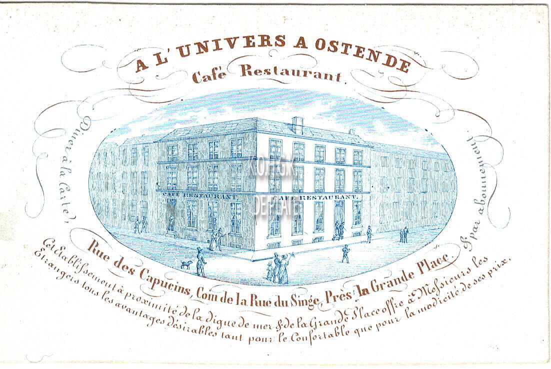 Formaat : 6,8 x 9,5 mm. - A l'Univers à Ostende, Café restaurant. Rue des Capucins, Coin de la Rue du Singe Prés la Grand Place. Diner à la Carte & par abonnement. Cet Etablisement à proximité de la Dique de mer & de la Grande Place offre à Messieurs les Etrangers tous les avantages désirables tant pour le Confortable que pour le modicité de ses prix.