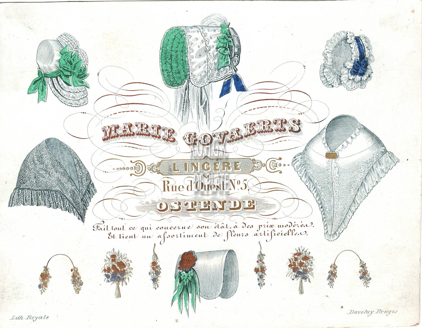 Formaat : 11 x 14,3 cm. - Marie Govaerts, Lingère Rue d'Ouest N° 5 Ostende. Fait tout ce qui concerne son étât à des prix modérés et tient un assortiment de fleurs artificielles.