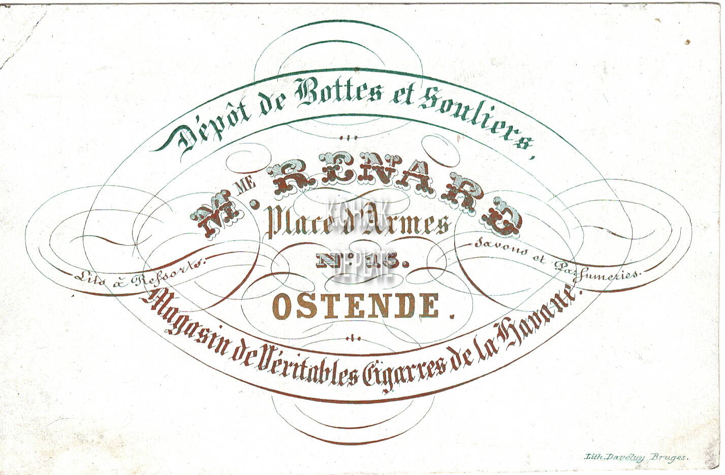 Formaat : 7,8 x 10 cm. - Dépôt de Bottes et Souliers Mme Renard Place d'Armes N° 15 Ostende. Magasin de Véritables Cigarres de la Havane. Lits à Ressorts. Savons et Parfumeries.