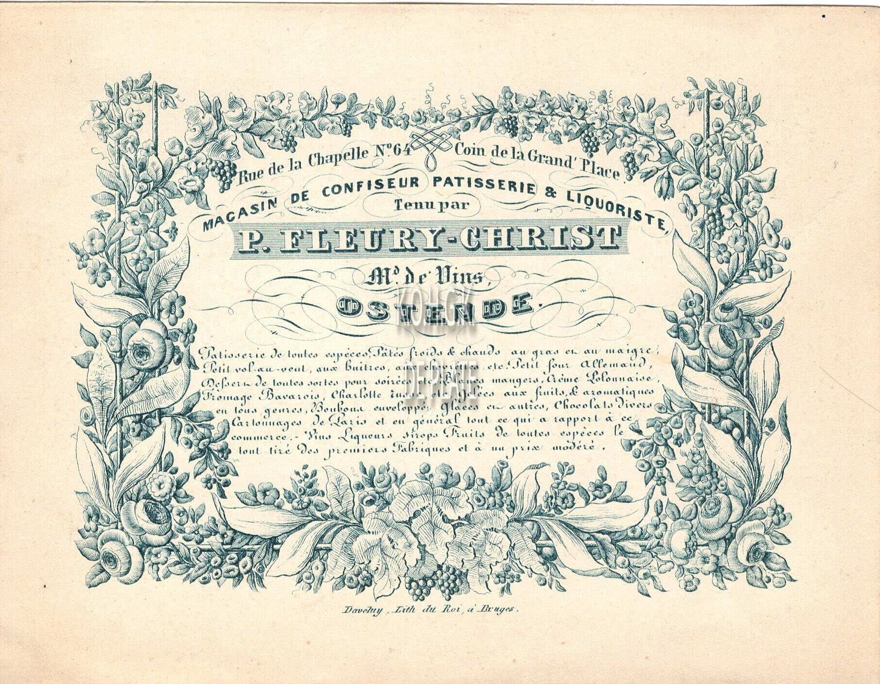 Formaat : 11,9 x 15,5 mm. - Magasin de Confiseur, Patisserie & liquoriste tenu par P.Fleury-Christ .,Ms de Vins Rue de la Chapelle, N° 64 coin de le Grand'Place. Patisserie de toutes espèces. Patés froids et chauds au gras et au maigre. Petit vol-au vent aux huitres aux chevrèttes etc. Petit four Allemand Dessers de toutes sortes pour soirées etc. Blancs mangers, Créme Polonnaise, Fromage Bavarois Charlotte russe etc. Gelées aux fruits & aromatiques en tous genre, Bonbons enveloppés, Glaces en autres Chocolata, divers Cartonnages de Paris et en général tout ce qui a rapport à ce commerce. Vins, Liqeuers, Sirops, Fruits de toutes espèces le tout tiré des premiers fabriques et à des prix modéré.