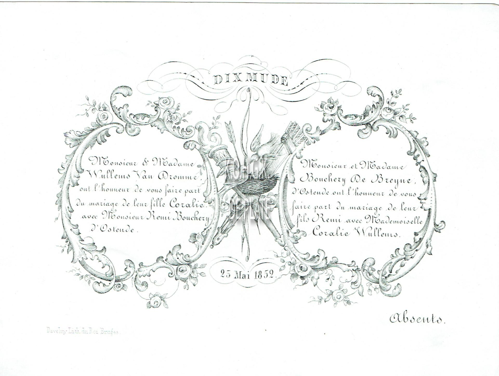 Formaat : 13,3 x 17,8 cm. - Monsieur & Madame Wullems Van Dromme ont l'honneur de vous faire part du mariage de leur fille Coralie avec Monsieur Remi Bouchery d'Ostende / Monsieur et Madame Bouchery De Breyne d'Ostende ont l'honneur de vous faire part du mariage de leur fils Remi avec Mademoiselle Coralie Wullems. - 25 Mai 1852