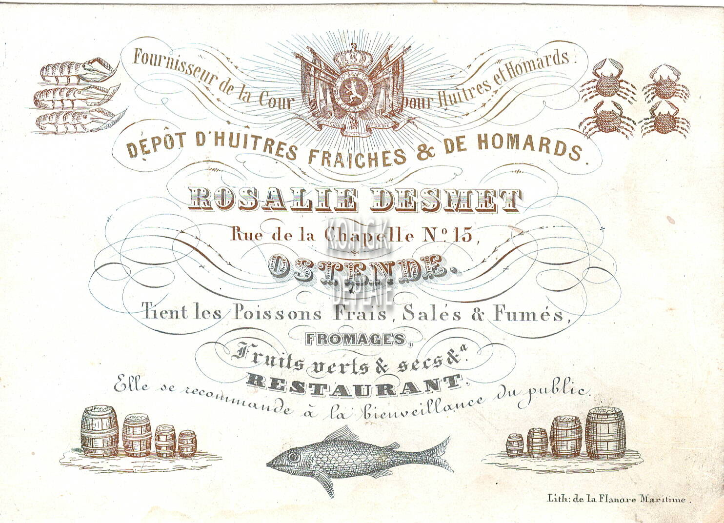 Formaat : 9 x 12,7 mm. - Dépôt d'Huitres fraiches & de Homards. Rosalie Desmet, Rue de la Chapelle N° 15 Ostende. Tient les Poissons Frais Salés & Fumés, Fromages, Fruits verts et secs &  Restaurant Elle se recommande à la bienveillance du public. Fournisseur de la Cour pour Huitres et Homards.