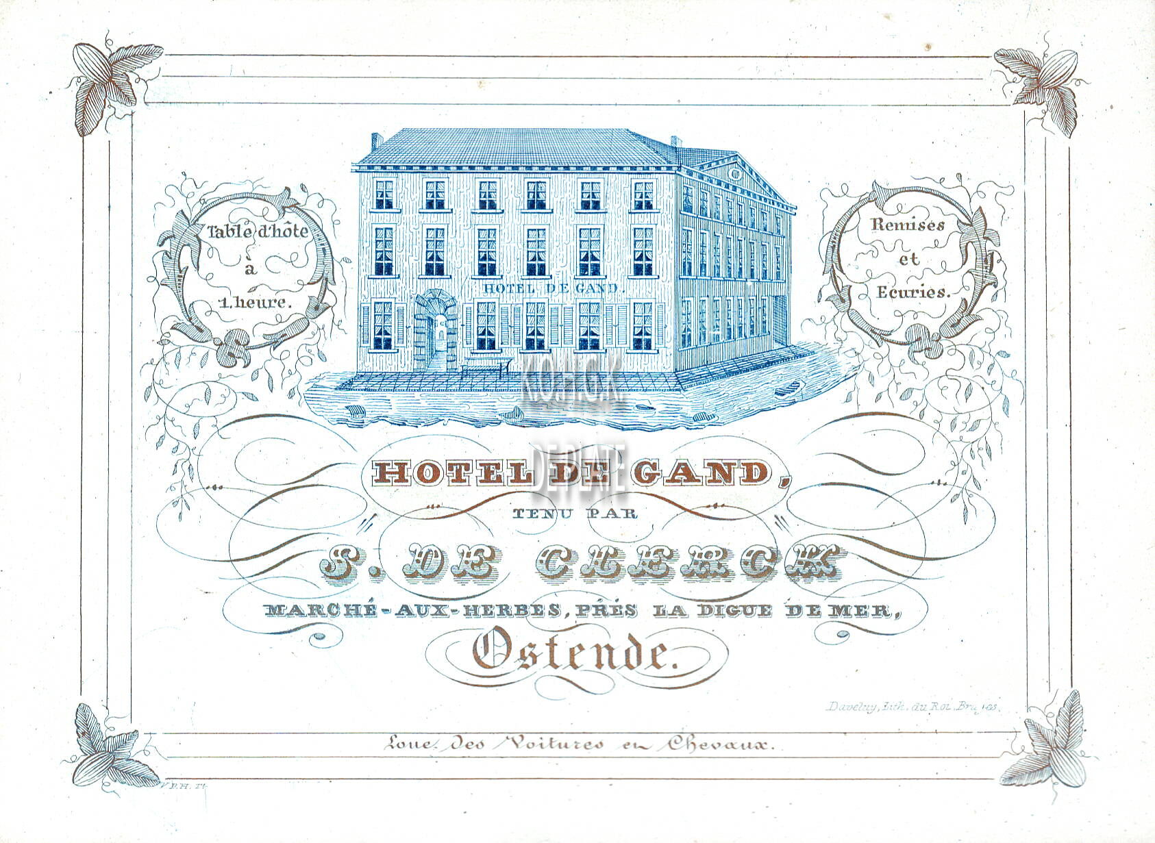 Formaat : 10,5 x 14,4 mm. - Hotel de Gand tenu par B.De Clerck, Marché-aux-herbes prés la Digue de Mer Ostende. Table d'hôte à 1 heure. Remises er Ecuries. Loue des Voitures en Cheveaux. Blauw ingekleurd.